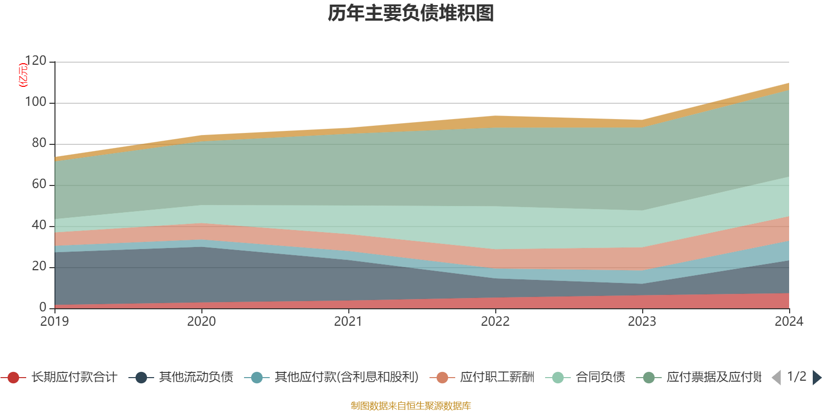 负债重大变化方面,截至2024年末,公司其他流动负债较上年末增加186.73%,占公司总资产比重上升3.64个百分点;其他应付款(含利息和股利)较上年末增加47.86%,占公司总资产比重上升0.95个百分点;应付票据及应付账款较上年末增加4.58%,占公司总资产比重下降0.47个百分点;长期应付款合计较上年末增加16.1%,占公司总资产比重上升0.19个百分点。