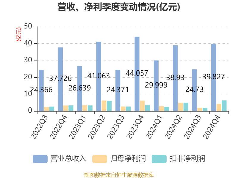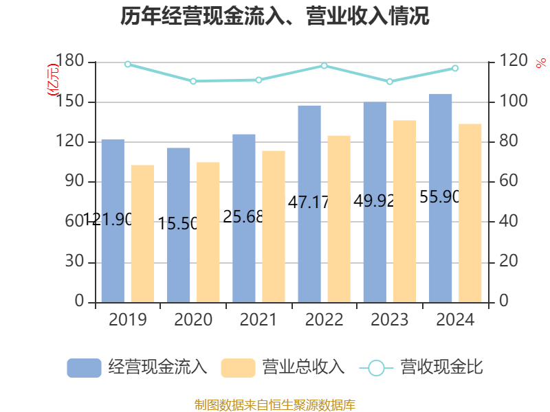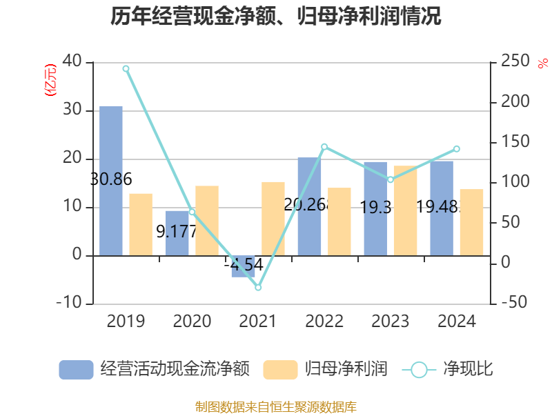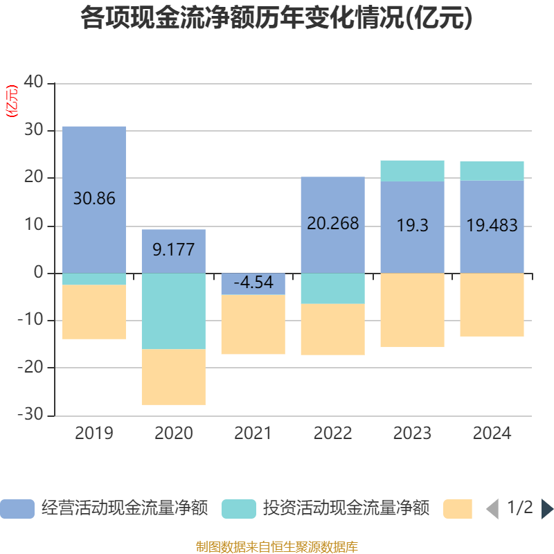截至2024年,公司经营活动现金流净额为19.48亿元,同比增长0.95%;筹资活动现金流净额-13.37亿元,同比增加2.2亿元;投资活动现金流净额4.04亿元,上年同期为4.4亿元。