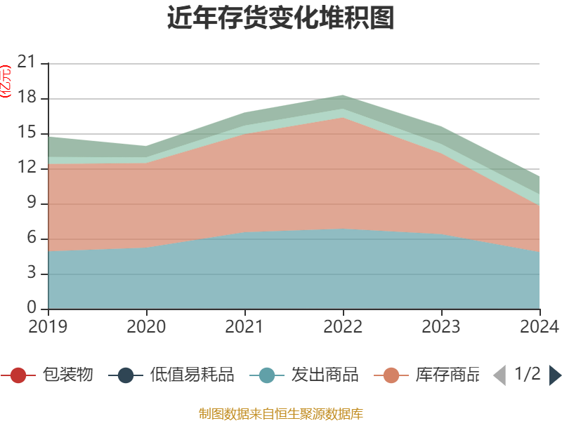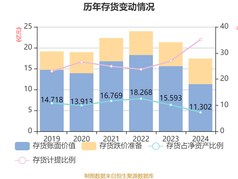 从存货变动来看,截至2024年末,公司存货账面价值为11.3亿元,占净资产的7.25%,较上年末减少4.29亿元。其中,存货跌价准备为6.12亿元,计提比例为35.14%。